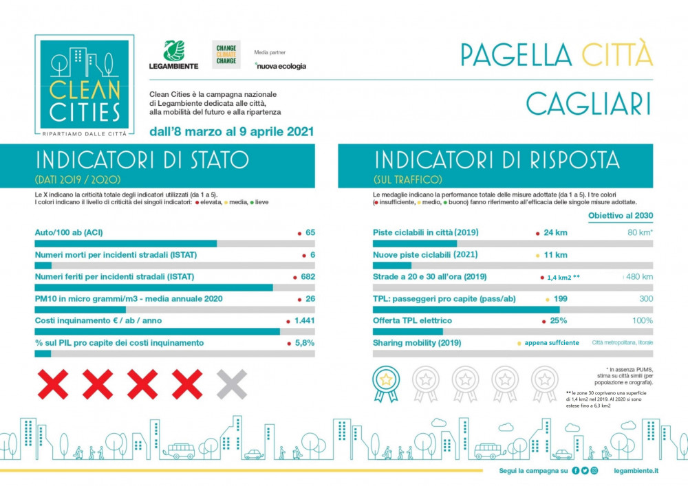 Ferma in Sardegna, a Cagliari, Clean Cities, nuova campagna itinerante di Legambiente con l’obiettivo di testare i capoluoghi italiani sui temi della mobilità e della transizione ecologica. Cagliari presenta una serie di criticità che ostacolano il passaggio verso una mobilità a zero emissioni: alto il tasso di motorizzazione, i costi sociali ed economici legati al suo inquinamento e l’offerta di mezzi pubblici. Interessanti, invece, la recente implementazione di piste ciclabili e l’offerta di sharing mobility rispetto alle altre città insulari e del sud Italia. Questi i dati più rilevanti emersi dalla “Pagella della Città” redatta da Legambiente nell’ambito della campagna, e consegnata simbolicamente oggi al Comune di Cagliari.