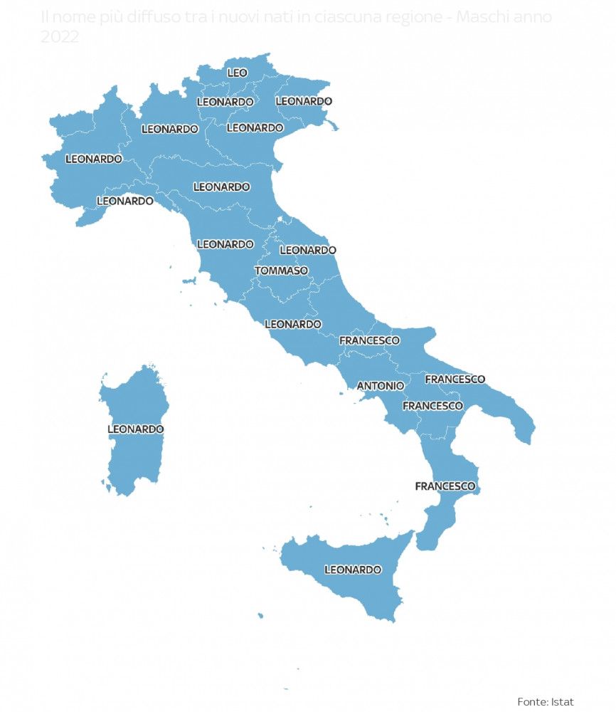 Leonardo è il nome preferito in gran parte delle regioni, tranne che in alcune eccezioni come la Provincia autonoma di Bolzano, dove primeggia il nome Leo, e in Umbria, dove prevale Tommaso. Anche molte regioni del Mezzogiorno come Abruzzo, Sicilia e Sardegna, confermano Leonardo come scelta principale. Francesco rimane stabile al primo posto in quattro regioni del Mezzogiorno (Molise, Puglia, Basilicata e Calabria) mentre Antonio continua a mantenere il primo posto in Campania.