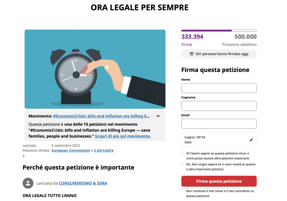La Società Italiana di Medicina Ambientale (Sima), presieduta da Alessandro Miani, ha lanciato una petizione online in collaborazione con "Consumerismo No Profit", che ha già raccolto 330.000 firme, con l'obiettivo di abolire il cambio dell'ora e mantenere l'ora legale per tutto l'anno. Secondo la Sima, questa misura porterebbe a un notevole risparmio energetico in Italia, pari a 720 milioni di kWh e 204 milioni di euro all'anno, considerando le tariffe attuali dell'energia elettrica nel mercato regolamentato. Questo risparmio potrebbe aumentare ulteriormente in caso di tensioni nel Medio Oriente, che potrebbero influire sui prezzi dell'energia elettrica.