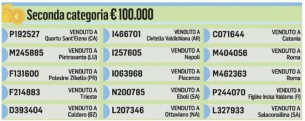 Anche qui è presente la Sardegna: a Olbia con il ticket numero E 151182 e San Sperate con il numero D 090300.