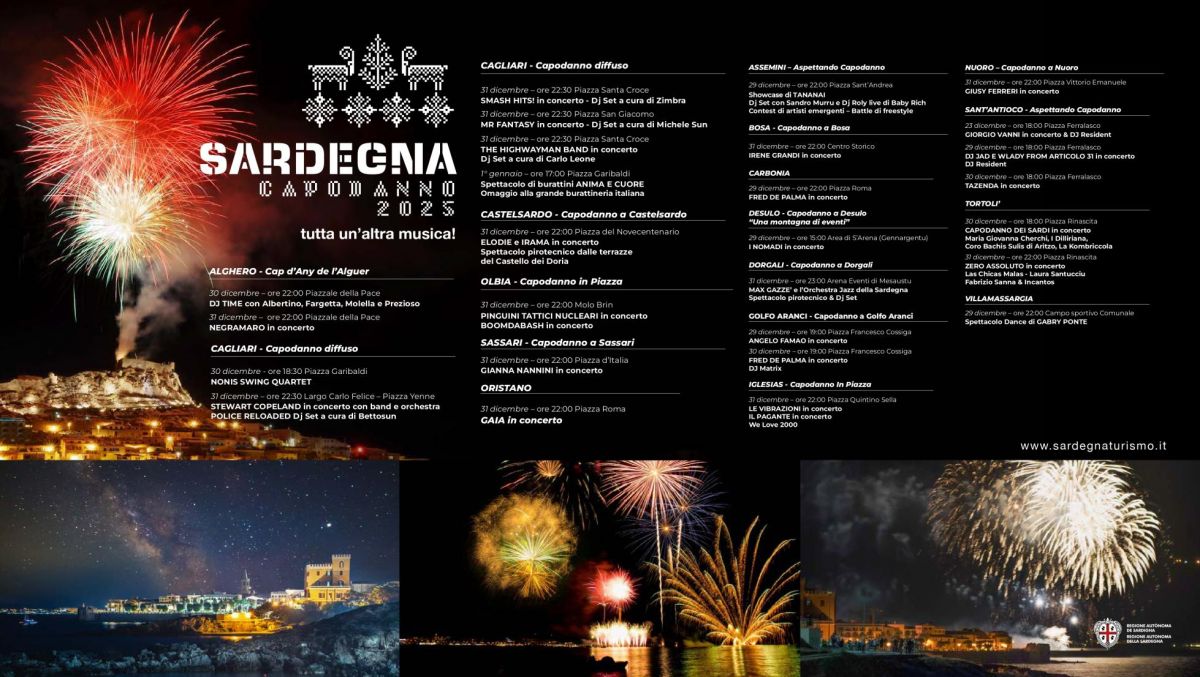 Sarà un fine 2025 all'insegna della musica, dell'accoglienza e del coinvolgimento quello che attende la Sardegna. L'Isola ha messo a punto un cartellone di eventi straordinario che si estende dal 27 al 31 dicembre e coinvolge ben 18 Comuni, trasformando paesaggi inimitabili e scenari suggestivi nella cornice perfetta per salutare il nuovo anno.