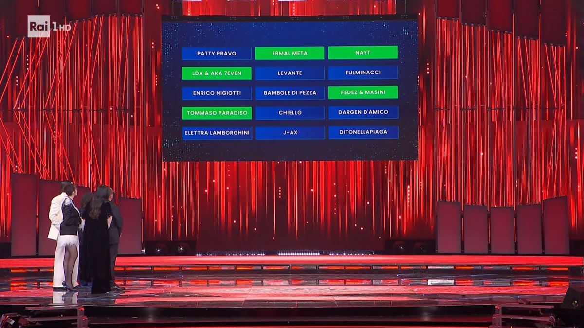 Dopo le esibizioni dei primi 15 artisti in gara, il palco del Teatro Ariston ha ospitato l’annuncio dei cinque brani che guidano la classifica provvisoria. Come da regolamento, i titoli sono stati comunicati senza specificare l’ordine di piazzamento.