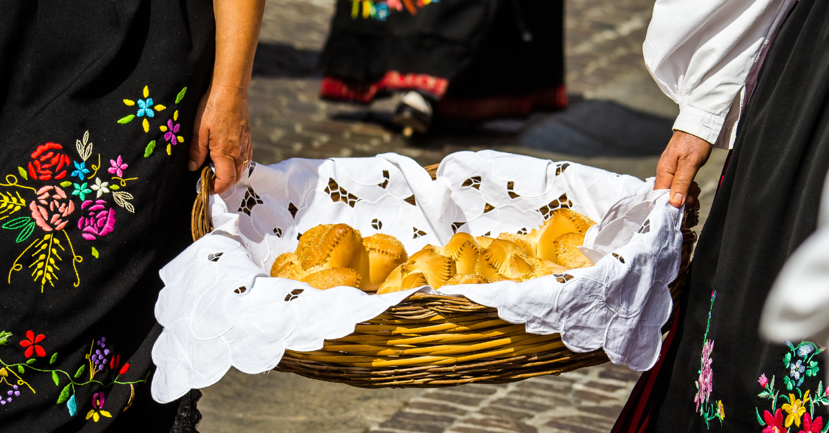 Accanto ai riti religiosi, la Domenica delle Palme porta in tavola specialità che fondono la tradizione pastorale con la cucina pasquale. Tra queste spicca il su coccoi cun s’ou, pane di semola di grano duro finemente decorato che racchiude un uovo sodo, simbolo di vita e rinascita. Altre preparazioni caratteristiche sono la sabramma, pane intrecciato con motivi simbolici, e sa pippia, una bambolina di pane con sette gambe che i bambini staccano una alla volta fino alla Pasqua. Il pane diventa anche panada, un cestino di pasta che racchiude agnello e carciofi, richiamo diretto alle tradizioni pastorali sarde.