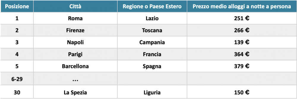 Anche quest’anno spiccano alcune mete per i prezzi medi particolarmente elevati. La località più costosa è Barcellona con 379 euro a notte, segue Parigi con 364 euro, davanti a Sorrento con 334: queste tre località sono le uniche a superare la soglia dei 300 euro a notte. Immediatamente dopo ma comunque sopra i 200 euro a notte troviamo Londra con 292 euro, Firenze con 266 euro, Venezia con 262 euro, Roma con 251 euro e infine Madrid con 249 euro.