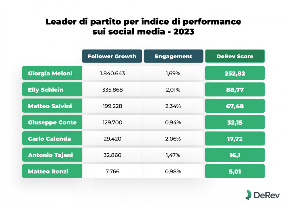 È indicativo che Schlein sia l'unico leader a essere assente da TikTok, fa notare il ceo di DeRev, Roberto Esposito: “Ciò denota o una mancanza di strategia o un disinteresse per i giovani al di sotto dei 25 anni. Anche sugli altri social, comunque, la sua comunicazione è estremamente debole e inefficace: ha pubblicato soltanto 943 post nell'anno, meno di chiunque altro, con risultati di engagement e di crescita piuttosto modesti"
