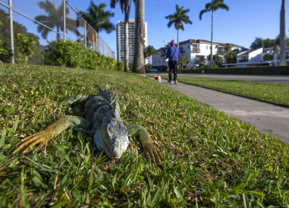 L’iguana verde, o iguana dai tubercoli (Iguana iguana), proviene dall’America centrale e meridionale ed è stata introdotta in Florida negli anni Sessanta. Essendo un animale ectotermo, non è in grado di regolare autonomamente la temperatura corporea, che dipende dall’ambiente esterno. Quando il freddo arriva all’improvviso, rallentano battito cardiaco, respirazione e movimenti: a terra diventano vulnerabili, sugli alberi perdono equilibrio e cadono.